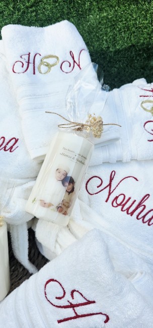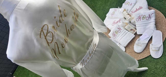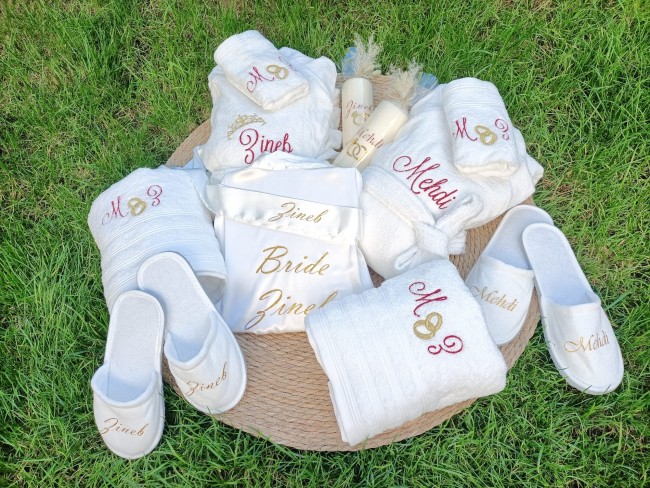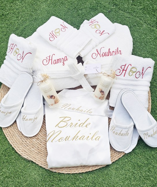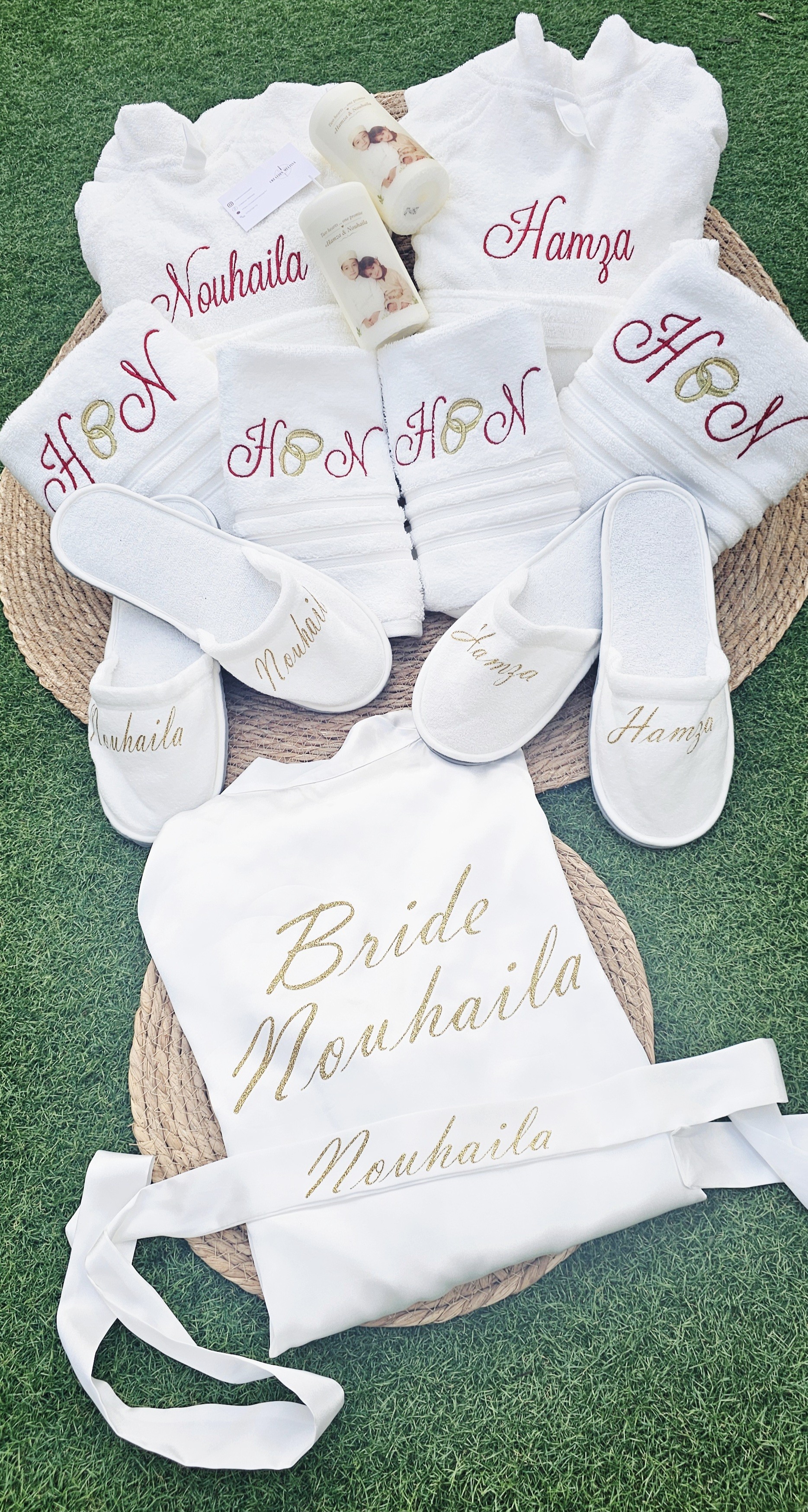 Deux mules de bain, un peignoir satiné pour la mariée et deux bougies, le tout dans une belle boîte personnalisée.