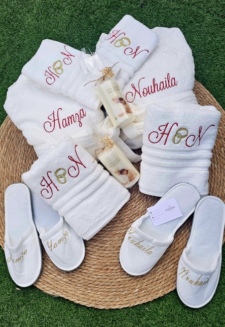 Deux peignoirs de bain , avec deux serviettes de tailles 50x100 cm et deux serviettes invités.